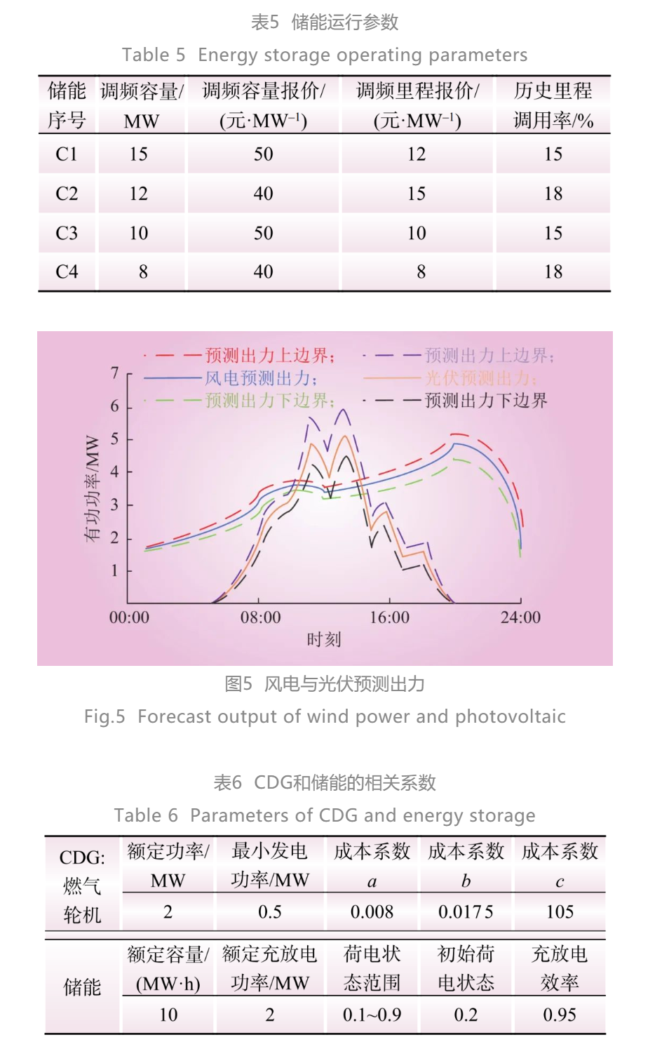 以IEEE-30節(jié)點(diǎn)系統(tǒng)來(lái)驗(yàn)證儲(chǔ)能參與調(diào)頻市場(chǎng)出清模型,系統(tǒng)含10臺(tái)機(jī)組,6臺(tái)為火電機(jī)組(G1~G6),4臺(tái)儲(chǔ)能(C1~C4),參數(shù)如表3~5所示。由VPP聚合的靈活性資源(儲(chǔ)能、CDG、柔性負(fù)荷、光伏與風(fēng)電)在01:00—09:00參與填谷調(diào)峰,在09:00—13:00和18:00—22:00參與削峰調(diào)峰,全天24時(shí)段可參與電能量市場(chǎng)。風(fēng)電、光伏出力預(yù)測(cè)如圖5所示,日前預(yù)測(cè)出力誤差為10%,可調(diào)控柔性負(fù)荷區(qū)間為2~6 MW,VPP內(nèi)CDG和儲(chǔ)能相關(guān)參數(shù)如表6所示。