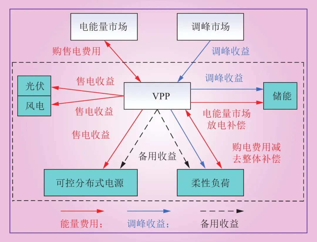 1)VPP聚合靈活性資源,以整體效益最大為目標(biāo)對(duì)外同時(shí)參與電能量市場(chǎng)和調(diào)峰市場(chǎng),通過(guò)儲(chǔ)能和柔性負(fù)荷的協(xié)同,實(shí)現(xiàn)調(diào)峰市場(chǎng)的有效競(jìng)標(biāo),使VPP及儲(chǔ)能獲得最佳調(diào)峰收益。