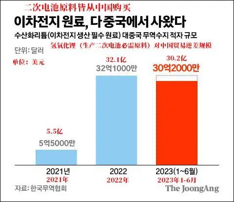 不過,正極材料出口越多,對(duì)正極材料的核心原料化合物和前驅(qū)體材料的進(jìn)口也就越多,而韓國的這部分進(jìn)口有“相當(dāng)大一部分”都來自中國。韓國《朝鮮日?qǐng)?bào)》5日引述報(bào)告稱,今年上半年,韓國進(jìn)口鋰電池材料和前驅(qū)體材料的貿(mào)易逆差分別達(dá)到50.9億美元和21.7億美元。其中,對(duì)華貿(mào)易逆差分別為30億美元和21.1億美元。也就是說,59%的鋰貿(mào)易逆差和97%的前驅(qū)體貿(mào)易逆差對(duì)象是中國。