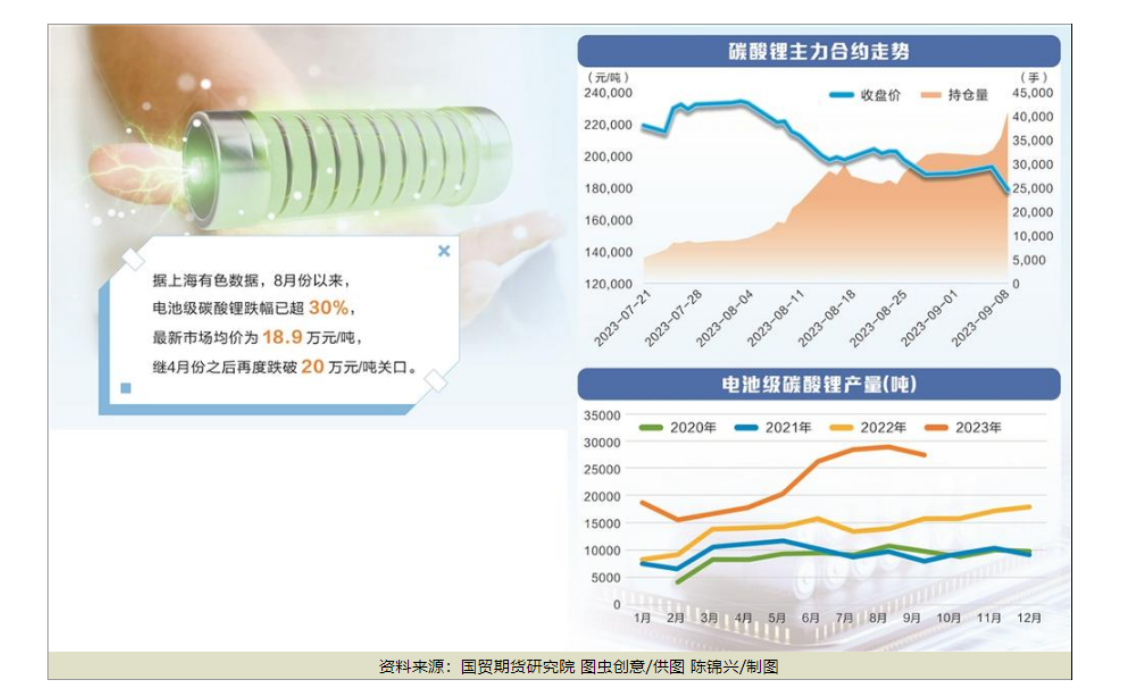 下游采購動力不足,原材料隨之走跌,電池級碳酸鋰再度跌破20萬元/噸,上海有色顯示的最新市場均價為18.9萬元/噸。