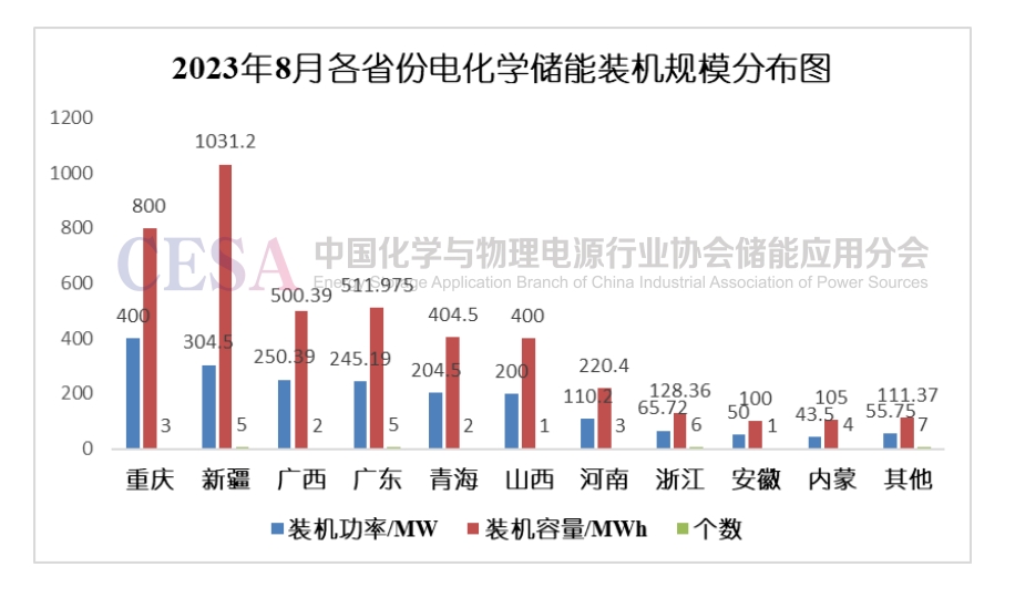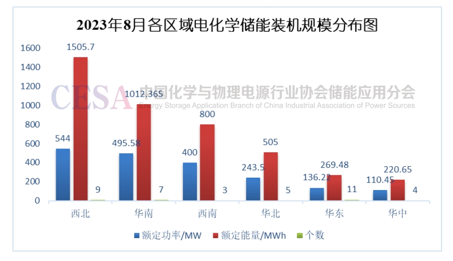圖3 2023年8月各區(qū)域電化學(xué)儲(chǔ)能裝機(jī)規(guī)模分布圖