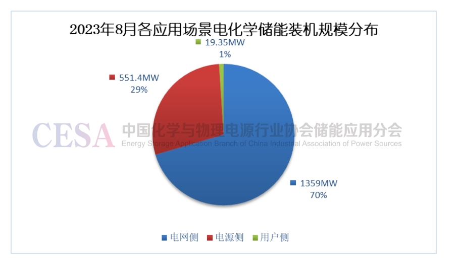 圖2 2023年8月各應(yīng)用場(chǎng)景電化學(xué)儲(chǔ)能裝機(jī)規(guī)模分布圖