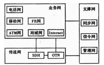 從功能的角度看,一個(gè)完整的現(xiàn)代通信網(wǎng)由業(yè)務(wù)網(wǎng)、傳送網(wǎng)和支撐網(wǎng)3部分組成。其中,業(yè)務(wù)網(wǎng)包括固定電話網(wǎng)、移動(dòng)通信網(wǎng)、FR網(wǎng)、局域網(wǎng)ATM網(wǎng)和Internet等;傳送網(wǎng)包括SDH和光傳送網(wǎng);支撐網(wǎng)包括信令網(wǎng)、管理網(wǎng)和同步網(wǎng)如圖1所示。