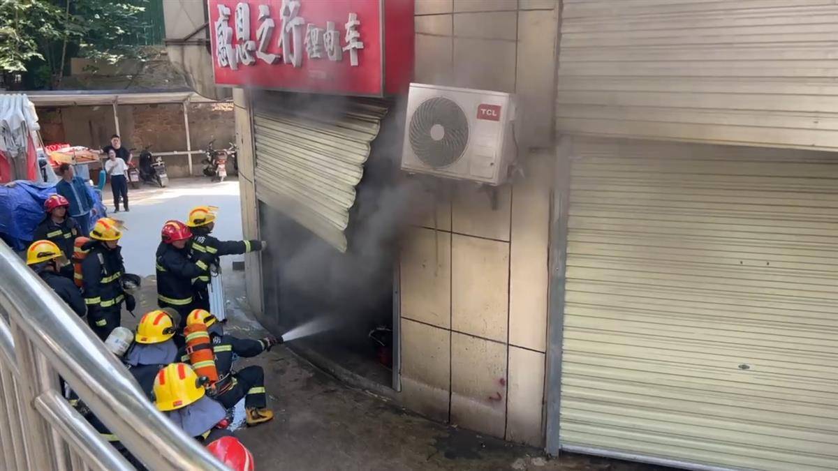 消防員到達(dá)現(xiàn)場(chǎng)后發(fā)現(xiàn),一電動(dòng)自行車商鋪卷簾門(mén)緊閉,里面冒出濃濃黑煙。消防員迅速設(shè)立警戒區(qū)域,并對(duì)圍觀群眾進(jìn)行疏散。因店主不在現(xiàn)場(chǎng)無(wú)法開(kāi)門(mén),消防員利用無(wú)齒鋸和板斧對(duì)卷簾門(mén)進(jìn)行破拆,在卷簾門(mén)被打開(kāi)后,發(fā)現(xiàn)店內(nèi)存放著大量電動(dòng)自行車及各類配件和鋰電池。消防員立即用水槍對(duì)起火位置進(jìn)行滅火,經(jīng)過(guò)近5分鐘的緊張撲救,現(xiàn)場(chǎng)明火被熄滅。隨后,消防員仔細(xì)檢查現(xiàn)場(chǎng),確認(rèn)無(wú)復(fù)燃危險(xiǎn)后撤離。