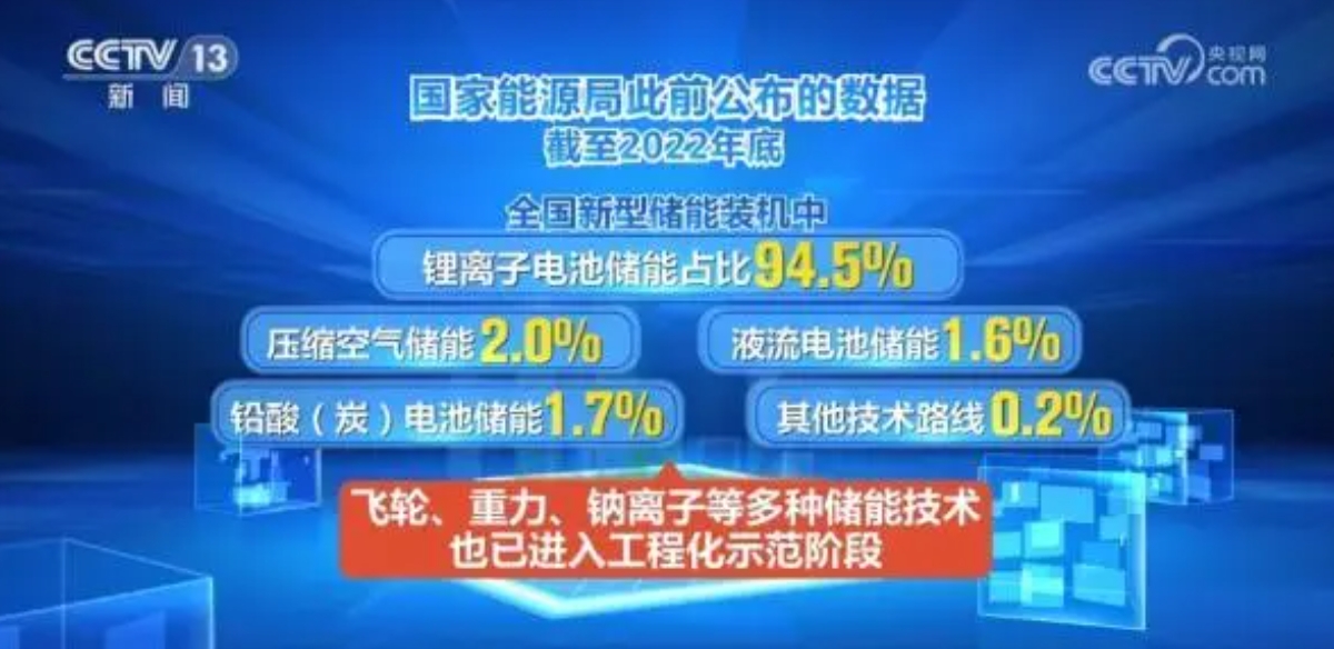 國家能源局此前公布的數(shù)據(jù),截至2022年底,全國新型儲能裝機中,鋰離子電池儲能占比94.5%、壓縮空氣儲能2.0%、液流電池儲能1.6%、鉛酸(炭)電池儲能1.7%,其他技術(shù)路線0.2%。飛輪、重力、鈉離子等多種儲能技術(shù)也已進入工程化示范階段。