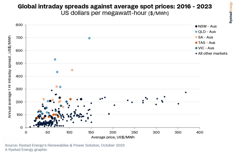 根據(jù)調(diào)研機構Rystad Energy公司最近進行的一項研究,根據(jù)公開數(shù)據(jù),在全球39個電力市場中,澳大利亞國家電力市場(NEM)的日內(nèi)電價波動幅度最大。緊隨其后的是日本和菲律賓的電力市場,以及美國的加利福尼亞州和德克薩斯州。
