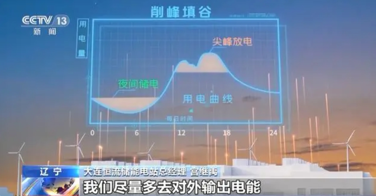 大連恒流儲能電站總經(jīng)理 宮繼禹:我們可以更大程度地去調(diào)節(jié)整個電網(wǎng)的靈活性,在用電低谷的時候,我們可以盡量多充電,在用電高峰的時候,我們可以去承擔(dān)電網(wǎng)發(fā)電的這部分任務(wù),我們盡量多去對外輸出電能,來保證我們整個電網(wǎng)的一個平穩(wěn)運(yùn)行。
