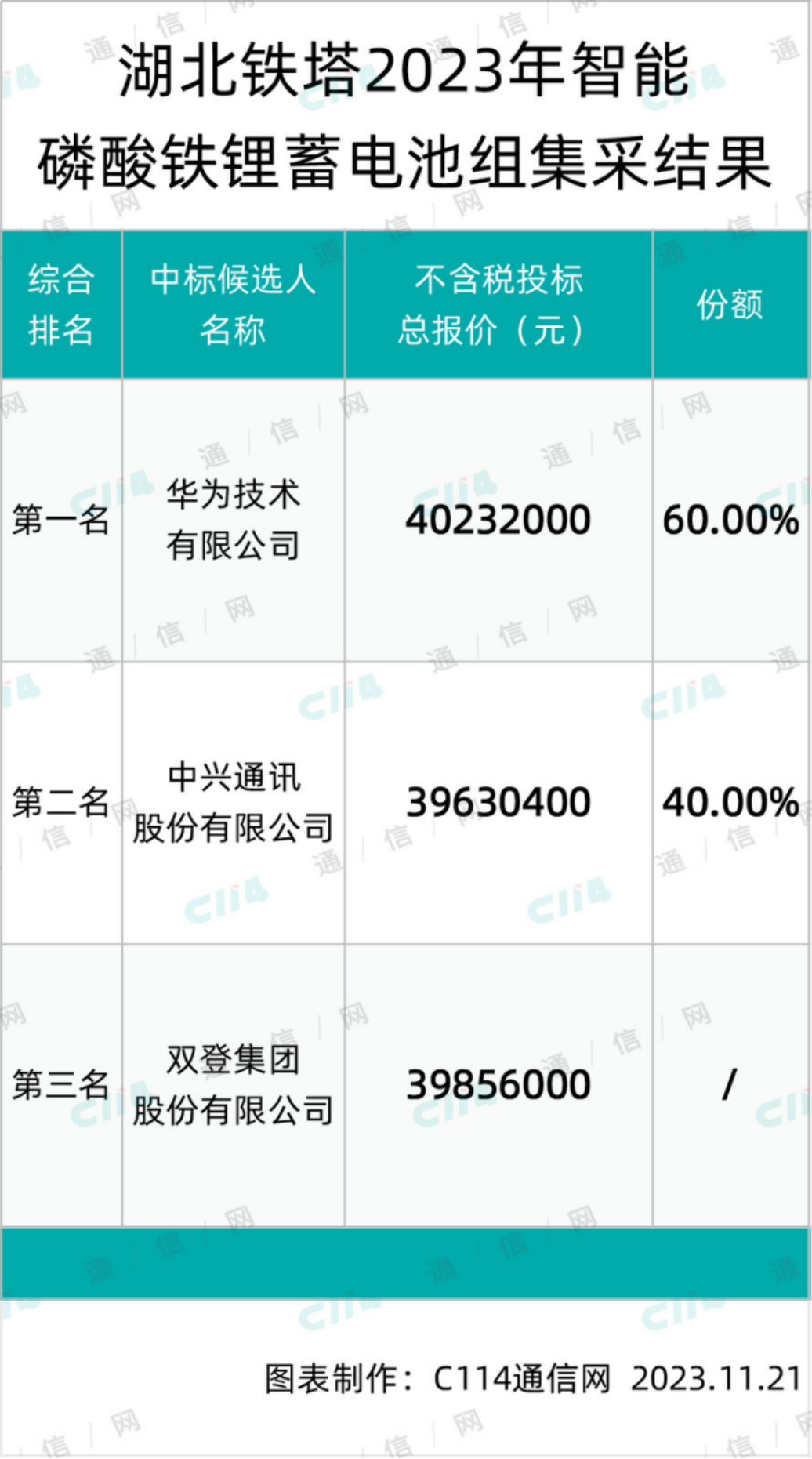 中國儲能網(wǎng)訊:11月21日消息(焦焦)從中國鐵塔官網(wǎng)獲悉,湖北鐵塔今日公示了2023年智能磷酸鐵鋰蓄電池組的集采結(jié)果,華為、中興兩家中標(biāo)。