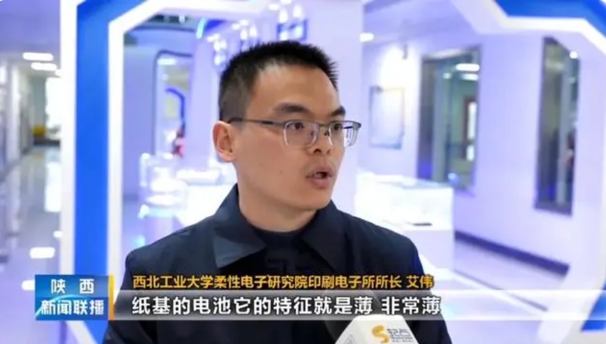 西北工業(yè)大學(xué)柔性電子研究院印刷電子所所長(zhǎng)艾偉:“紙基的電池特征就是薄、非常薄,如果和我們現(xiàn)有的柔性的屏結(jié)合到一起,整個(gè)器件都可以輕薄的特征就凸顯出來(lái)了,首先是實(shí)現(xiàn)了它的電極的制備,實(shí)現(xiàn)快速批量的制備,就可以實(shí)現(xiàn)它像造紙一樣連續(xù)的生產(chǎn)?!?