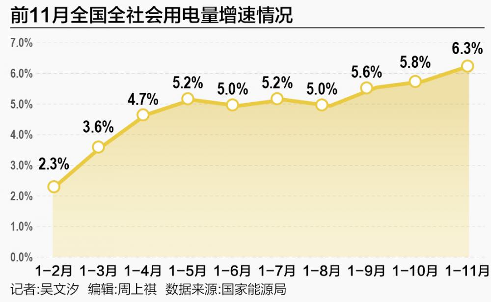 根據(jù)國家能源局日前公布數(shù)據(jù),今年1~11月,全社會用電量累計83678億千瓦時,同比增長6.3%。11月,全社會用電量7630億千瓦時,同比增長11.6%。