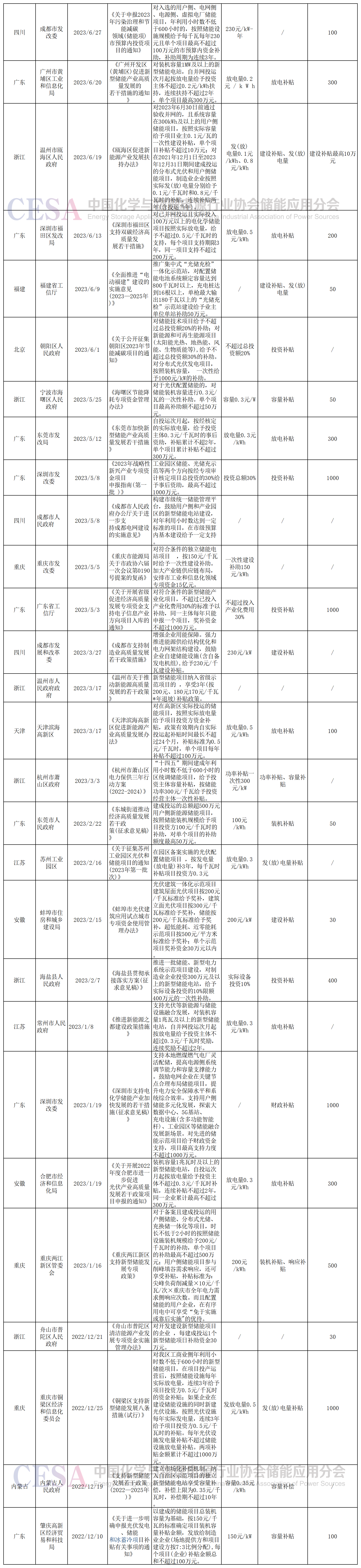 2023年11月,廣州市黃埔區(qū)工業(yè)和信息化局印發(fā)《促進新型儲能產(chǎn)業(yè)高質(zhì)量發(fā)展的若干措施實施細則的通知》明確,對本措施有效期內(nèi)在本區(qū)范圍內(nèi)建設、并網(wǎng)且裝機容量達1兆瓦及以上的新型儲能電站,對2023、2024年投運的儲能電站按放電量給予投資主體不超過0.2元/千瓦時扶持,補貼期最多2年,單個項目最高300萬元;2025年投運給予0.15元/千瓦時扶持;2026年投運按0.1元/千瓦時扶持。