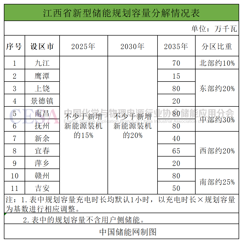 《規(guī)劃》提出,江西省到2025年、2030年,力爭實現(xiàn)各設(shè)區(qū)市新型儲能投產(chǎn)規(guī)模不少于新增新能源裝機的15%、20%。到2035年,力爭實現(xiàn)全省新型儲能投產(chǎn)6GW以上。
