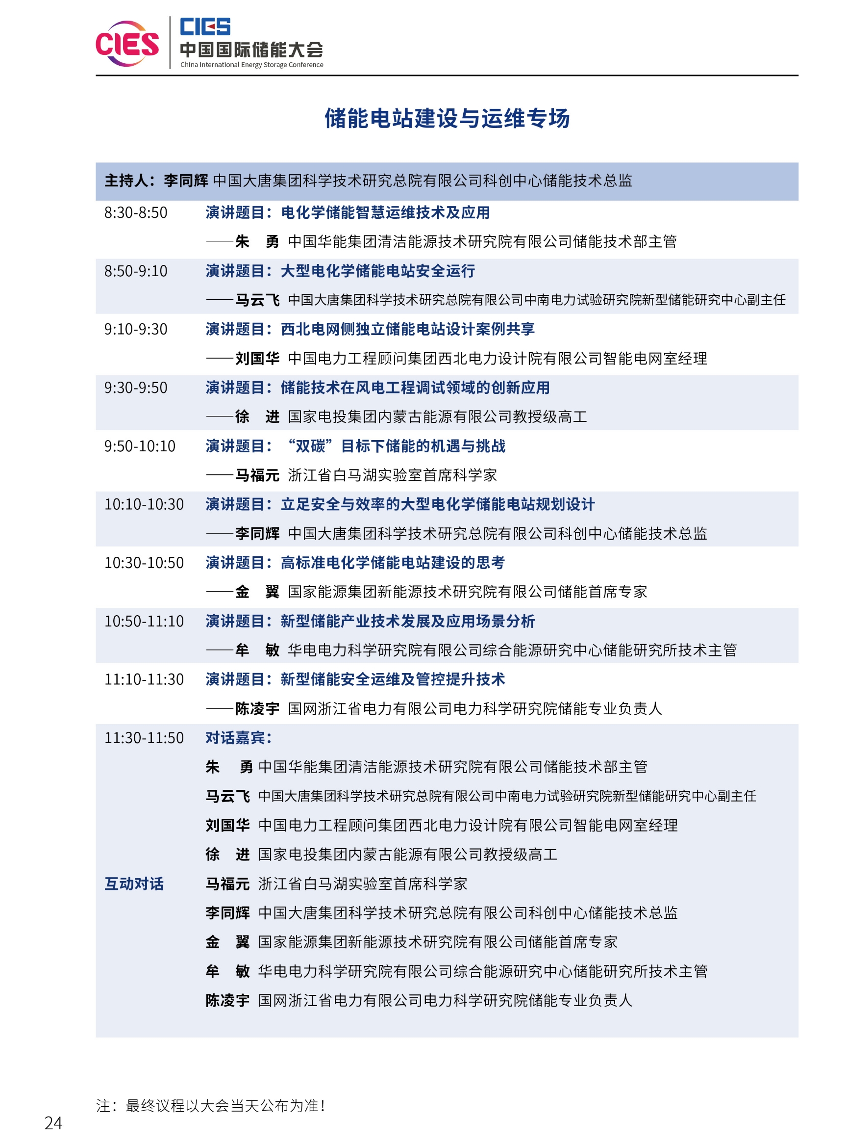 中國儲能網(wǎng)訊:2024CIES第十四屆中國國際儲能大會暨展覽會即將于3月11-13日在杭州國際博覽中心盛大召開,今日起,大會17個專場議程相繼發(fā)布,最終議程以活動當天公布為準。