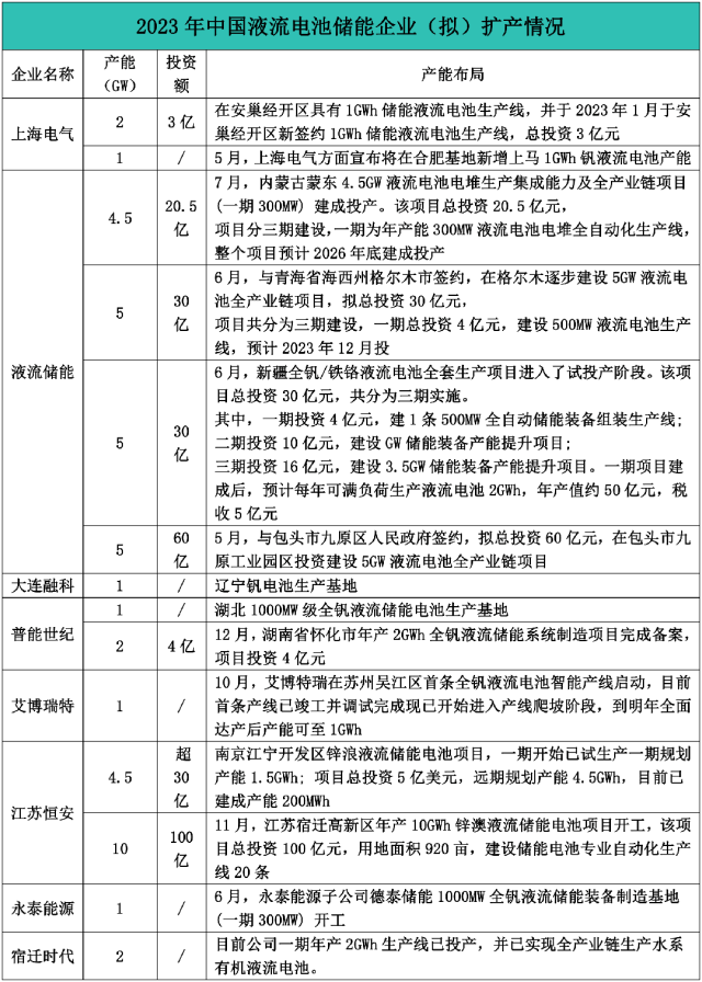 中國儲能網(wǎng)訊:2023年中國液流電池儲能企業(yè)(擬)擴產(chǎn)情況
