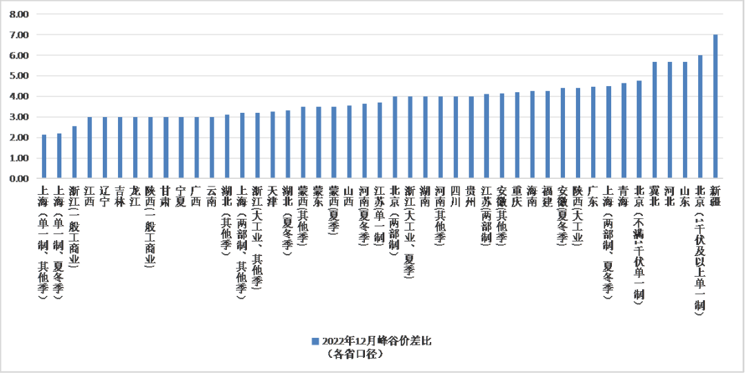 峰谷價差持續(xù)拉大。各地高峰電價上浮普遍在50%-70%之間。上海單一制用戶、浙江一般工商業(yè)用戶高峰電價上浮比例較低;夏冬季中的上海兩部制用戶和安徽用戶,以及北京1千伏及以上單一制用戶,高峰上浮比例最高,達到或超過了80%。低谷電價下浮也集中在50%-70%區(qū)間。按高峰低谷電價比值測算,各地峰谷價差比普遍超過3.0倍,新疆、北京(1千伏及以上單一制)、山東、河北與冀北則超過了5.0倍。