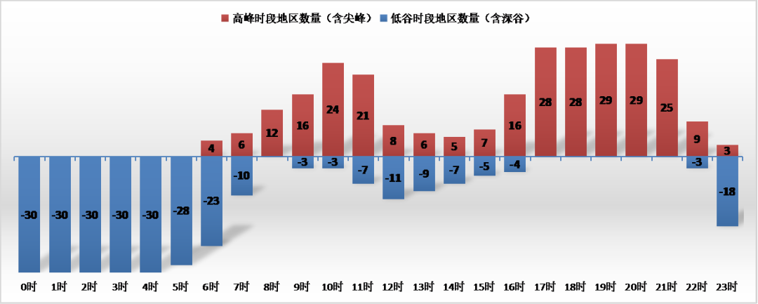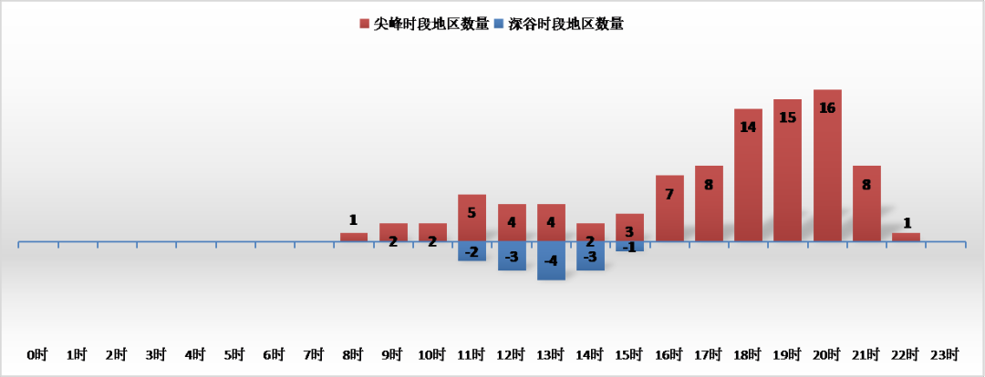分月觀察尖峰、深谷時段可知,居民調(diào)溫負荷、新能源出力是影響時段劃分的兩個重要因素。1-2月和7-8月是各地尖峰時段設置比較集中的月份,其中冬季在17:00-20:00、夏季在16:00-21:00之間,說明居民調(diào)溫負荷較高時,各地削峰需求最大。在冬季設置深谷時段的地區(qū)相對較少,說明深谷時段的劃分也重點考慮了光照強度對光伏出力的影響。