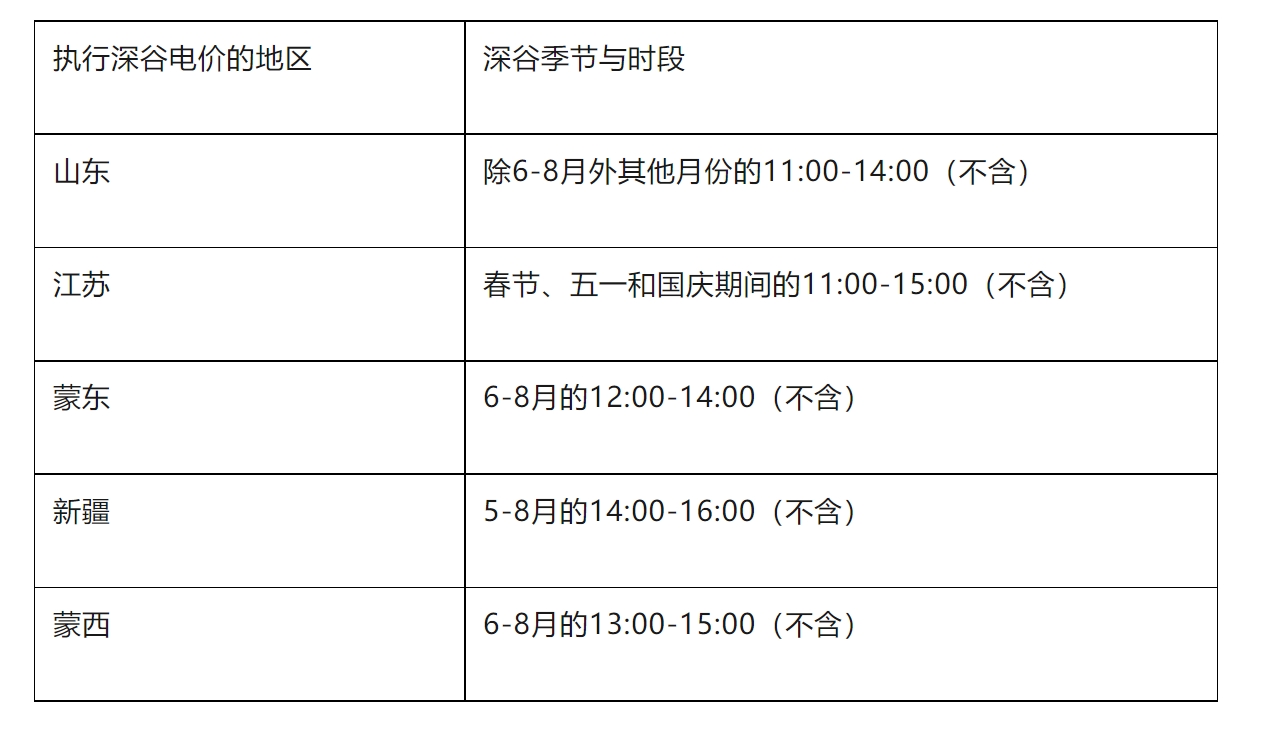 更多地區(qū)開始嘗試深谷電價制度。除山東外,江蘇、蒙東、新疆及蒙西也開始施行深谷電價。山東夏季無深谷,蒙東、新疆和蒙西則僅在夏季有深谷。江蘇比較特別,明確在春節(jié)、五一和國慶節(jié)日期間實行深谷。各地區(qū)深谷時段集中在11:00-15:00的五個小時內(nèi)。