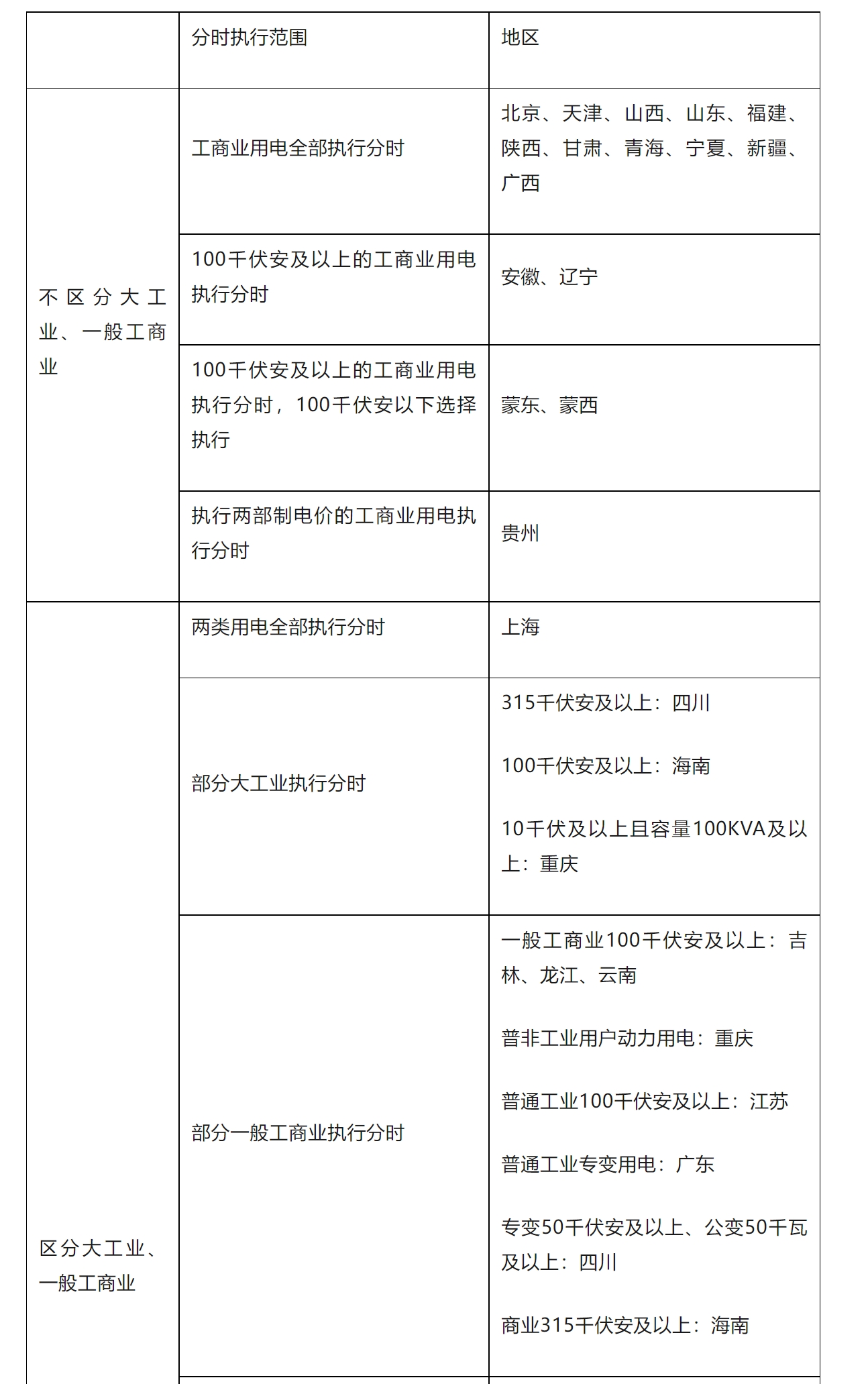 表1 各地工商業(yè)分時電價執(zhí)行范圍