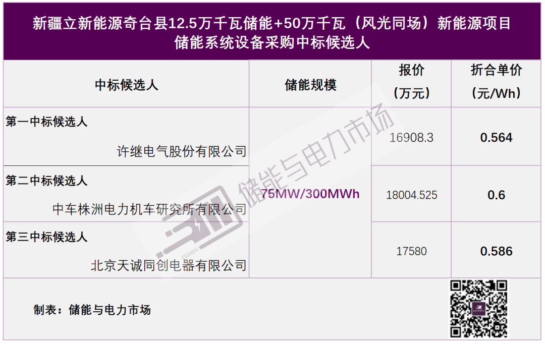 中國儲能網(wǎng)訊:2月8日,新疆立新能源奇臺縣12.5萬千瓦儲能+50萬千瓦(風(fēng)光同場)新能源項(xiàng)目儲能系統(tǒng)設(shè)備采購中標(biāo)候選人公示。涉及儲能規(guī)模75MW/300MWh,許繼電氣以單價(jià)0.564元/Wh,預(yù)中標(biāo)該項(xiàng)采購。