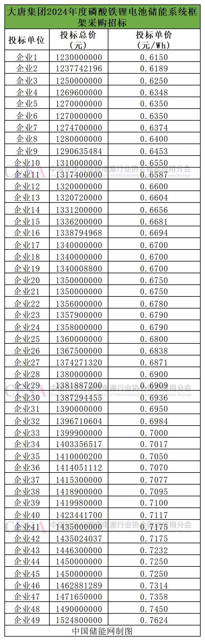 該框采項目在開標階段曾吸引了49家企業(yè)參與投標,最低報價0.615元/Wh,最高報價0.762元/Wh,平均報價0.683元/Wh。