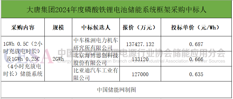 2月18日,中國大唐集團有限公司2024年度磷酸鐵鋰電池儲能系統(tǒng)框架采購公示中標結(jié)果,中車株洲所、海博思創(chuàng)、比亞迪三家企業(yè)中標,報價區(qū)間為0.635-0.687元/Wh。