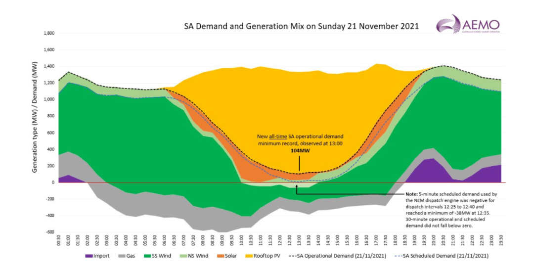 2021年10月,南澳州配電網(wǎng)又多次出現(xiàn)“負(fù)需求”現(xiàn)象(均發(fā)生在周日)。10月31日,當(dāng)?shù)嘏潆娋W(wǎng)的凈負(fù)荷連續(xù)4小時(shí)為負(fù)值,在13:00—13:30的半小時(shí)內(nèi)達(dá)到創(chuàng)紀(jì)錄的-69.4兆瓦,運(yùn)營最低需求僅188兆瓦。2021年11月21日,隨著屋頂光伏出力增加,運(yùn)營最低需求又降至104兆瓦。