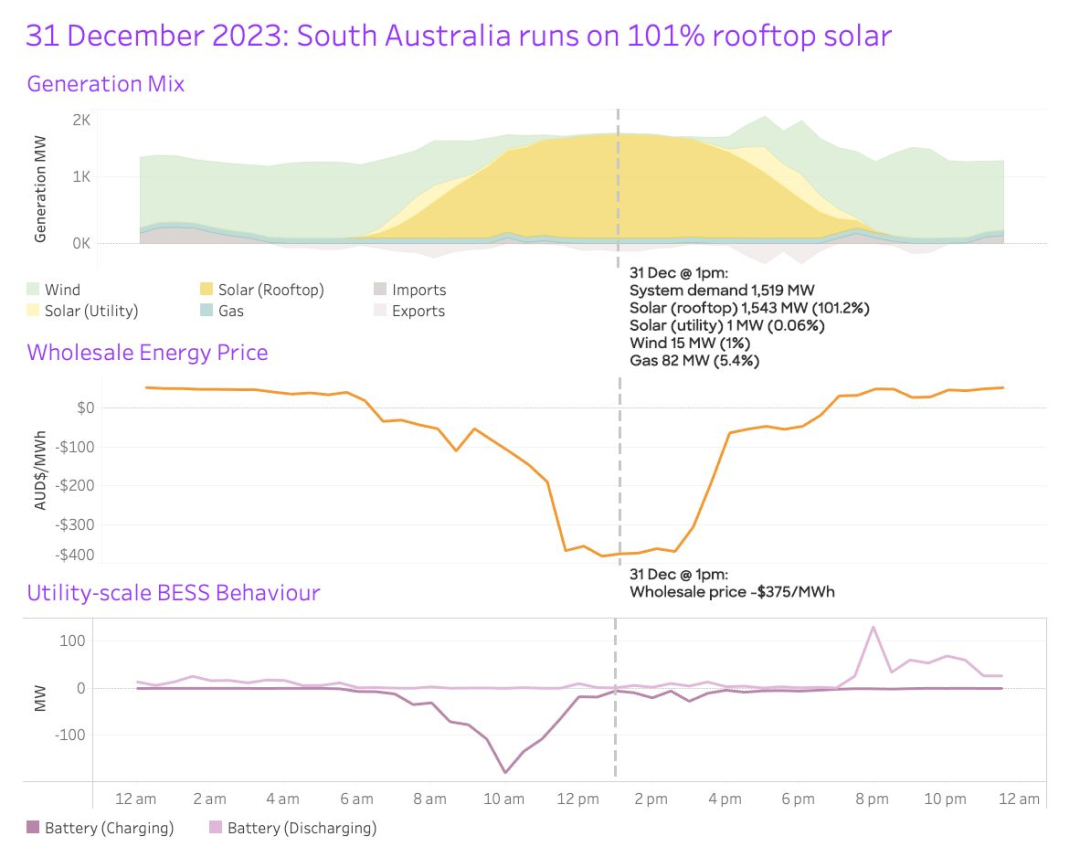 2023年12月31日下午,屋頂光伏發(fā)電可滿足南澳州101%的電力總需求。南澳州電網(wǎng)成為全球首個(gè)實(shí)現(xiàn)負(fù)運(yùn)營需求(Operational Demand)的吉瓦規(guī)模電網(wǎng)。