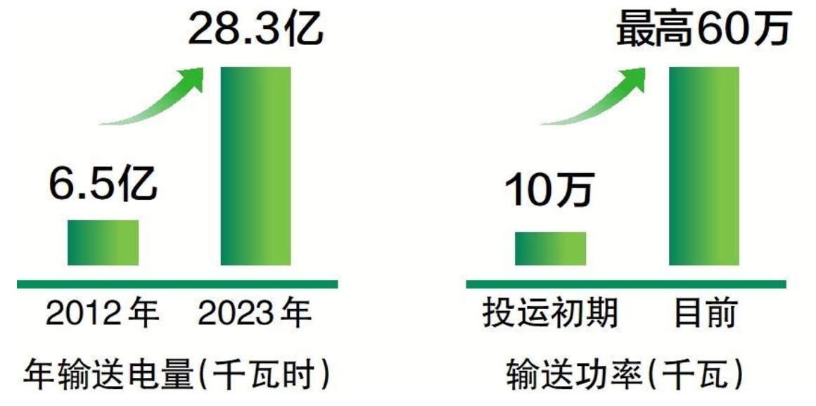 青藏聯(lián)網(wǎng)工程是第一個“電力天路”工程,于2011年12月建成投運,架起了連接青藏的能源“大動脈”,已安全平穩(wěn)運行超12年。自工程投運以來,柴拉直流系統(tǒng)雙向輸送能力不斷提升,輸送功率由投運初期的10萬千瓦提升至目前的最高60萬千瓦,柴拉直流大功率運行已成常態(tài)。自2015年起,這條能源大通道以西藏地區(qū)每年水電豐水期“藏電送青”、枯水期“青電入藏”的規(guī)律特性輸送電能,輸送電量逐年增長,年輸電量由2012年的6.5億千瓦時增長至2023年的28.3億千瓦時。