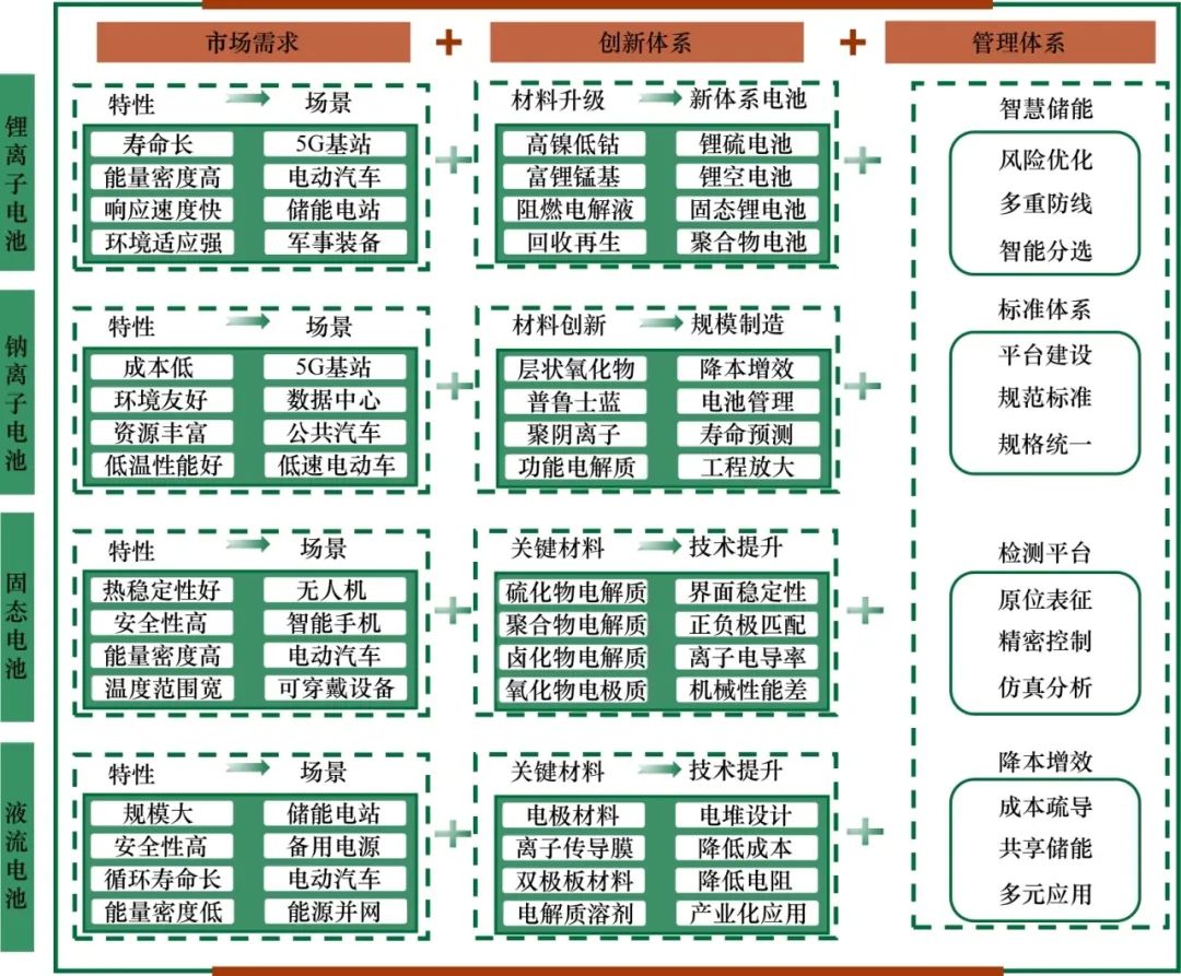 關(guān)鍵材料研究是發(fā)展電化學(xué)儲能技術(shù)的基礎(chǔ)。當(dāng)前的儲能材料研發(fā)高度依賴研究者的“嘗試法”實(shí)驗(yàn)、積累經(jīng)驗(yàn)與科學(xué)直覺,實(shí)驗(yàn)室研究也無法滿足各類應(yīng)用場景對儲能器件能量密度、功率密度、循環(huán)壽命的需求。需要采取由應(yīng)用驅(qū)動(dòng)的“逆向思維”來設(shè)計(jì)材料結(jié)構(gòu)。發(fā)揮大數(shù)據(jù)、人工智能技術(shù)對相關(guān)模擬計(jì)算的賦能作用,面向各類具體應(yīng)用場景,針對性開展儲能系統(tǒng)、儲能器件、關(guān)鍵材料設(shè)計(jì)并挖掘有效組合;以基礎(chǔ)技術(shù)創(chuàng)新提高電池材料和組件的研發(fā)水平,促進(jìn)電池的優(yōu)質(zhì)制造與規(guī)?;渴?。在工業(yè)應(yīng)用背景下開展相關(guān)基礎(chǔ)研究,立足現(xiàn)實(shí)條件對新材料及組件技術(shù)進(jìn)行交叉驗(yàn)證,加快確定科學(xué)的選材方向以加速推動(dòng)電池技術(shù)演進(jìn)。