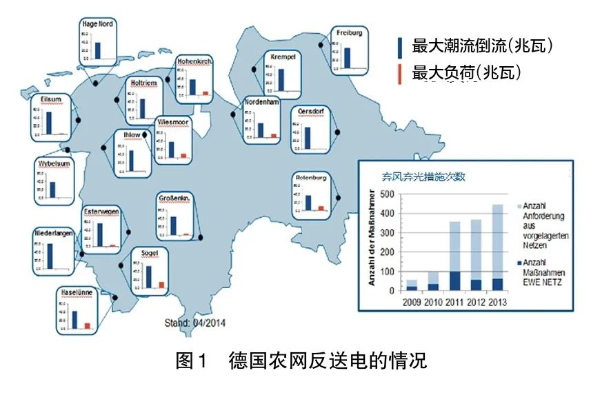 在德國,多達97%的新能源發(fā)電設(shè)施安裝在配電網(wǎng),尤其是農(nóng)村電網(wǎng)中。德國曾遭遇類似挑戰(zhàn)。以德國北部的農(nóng)村電網(wǎng)為例,其風(fēng)能和光伏的反送功率在2014年就已經(jīng)超過了當?shù)仄骄摵傻氖兑陨希ㄒ妶D1)。