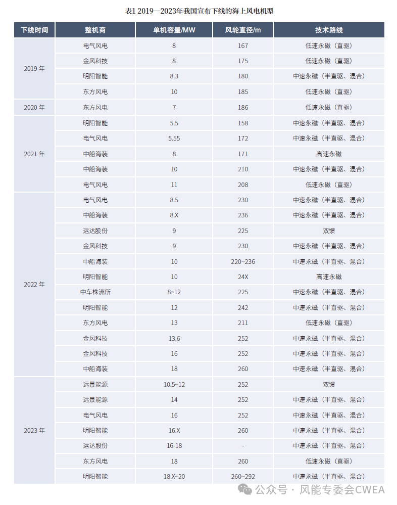 在2023年下線或發(fā)布的海上風電機型中,技術路線較單一,以中速永磁(半直驅(qū)、混合式)為主。這表明,經(jīng)過2~3年的市場驗證,中速永磁(半直驅(qū)、混合式)技術路線已被絕大多數(shù)廠商接受,成為權衡海上風電機組產(chǎn)品低成本、高可靠性與高效率“不可能三角”的最佳選擇。