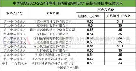 2023年12月28日,中國鐵塔2023-2024年備電用磷酸鐵鋰電池產(chǎn)品集中招標(biāo)項(xiàng)目公示中標(biāo)候選人。本項(xiàng)目共33名投標(biāo)人參與投標(biāo),最終,11家企業(yè)入圍中標(biāo)候選人。