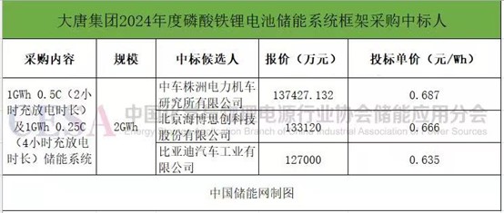 此前的一次大規(guī)模儲能系統(tǒng)集采進(jìn)展發(fā)生在2月18日,中國大唐集團(tuán)有限公司2024年度磷酸鐵鋰電池儲能系統(tǒng)框架采購公示中標(biāo)結(jié)果,中車株洲所、海博思創(chuàng)、比亞迪三家企業(yè)中標(biāo),報價區(qū)間為0.635-0.687元/Wh。