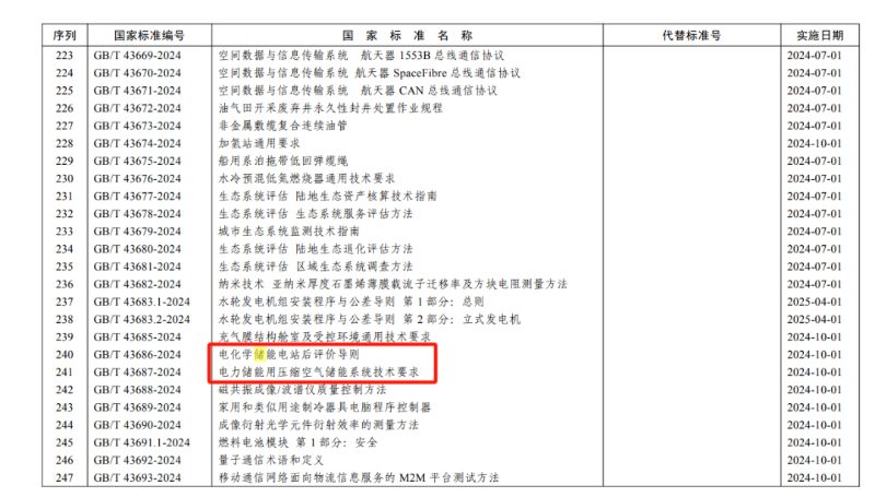 其中,2項(xiàng)儲(chǔ)能相關(guān)國(guó)家標(biāo)準(zhǔn)分別為《電化學(xué)儲(chǔ)能電站后評(píng)價(jià)導(dǎo)則》、《電力儲(chǔ)能用壓縮空氣儲(chǔ)能系統(tǒng)技術(shù)要求》,此外2項(xiàng)電池相關(guān)的國(guó)家標(biāo)準(zhǔn)分別為 《質(zhì)子交換膜燃料電池第6部分:雙板板特性測(cè)試方法》《鋰離子電池和電池組能源轉(zhuǎn)換效率要求和測(cè)量方法》,上述標(biāo)準(zhǔn)都將于2024年10月1日起實(shí)施。