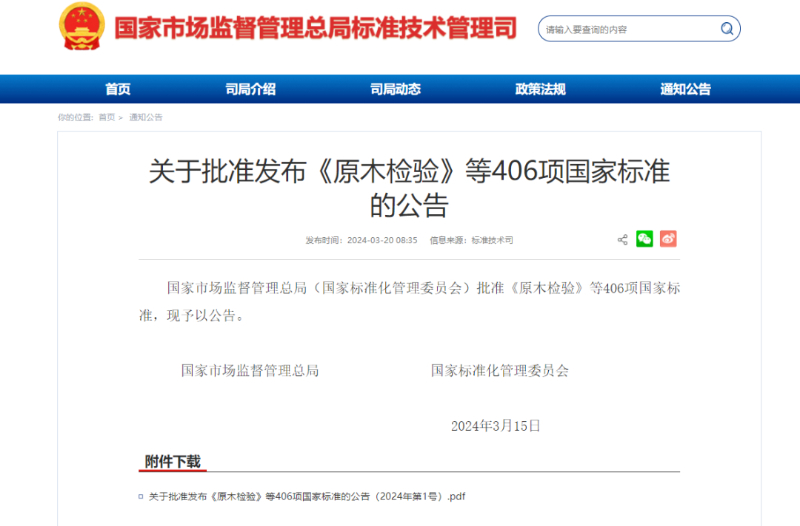 中國(guó)儲(chǔ)能網(wǎng)訊:3月15日,國(guó)家市場(chǎng)監(jiān)督管理總局(國(guó)家標(biāo)準(zhǔn)化管理委員會(huì))批準(zhǔn)《原木檢驗(yàn)》等406項(xiàng)國(guó)家標(biāo)準(zhǔn)。