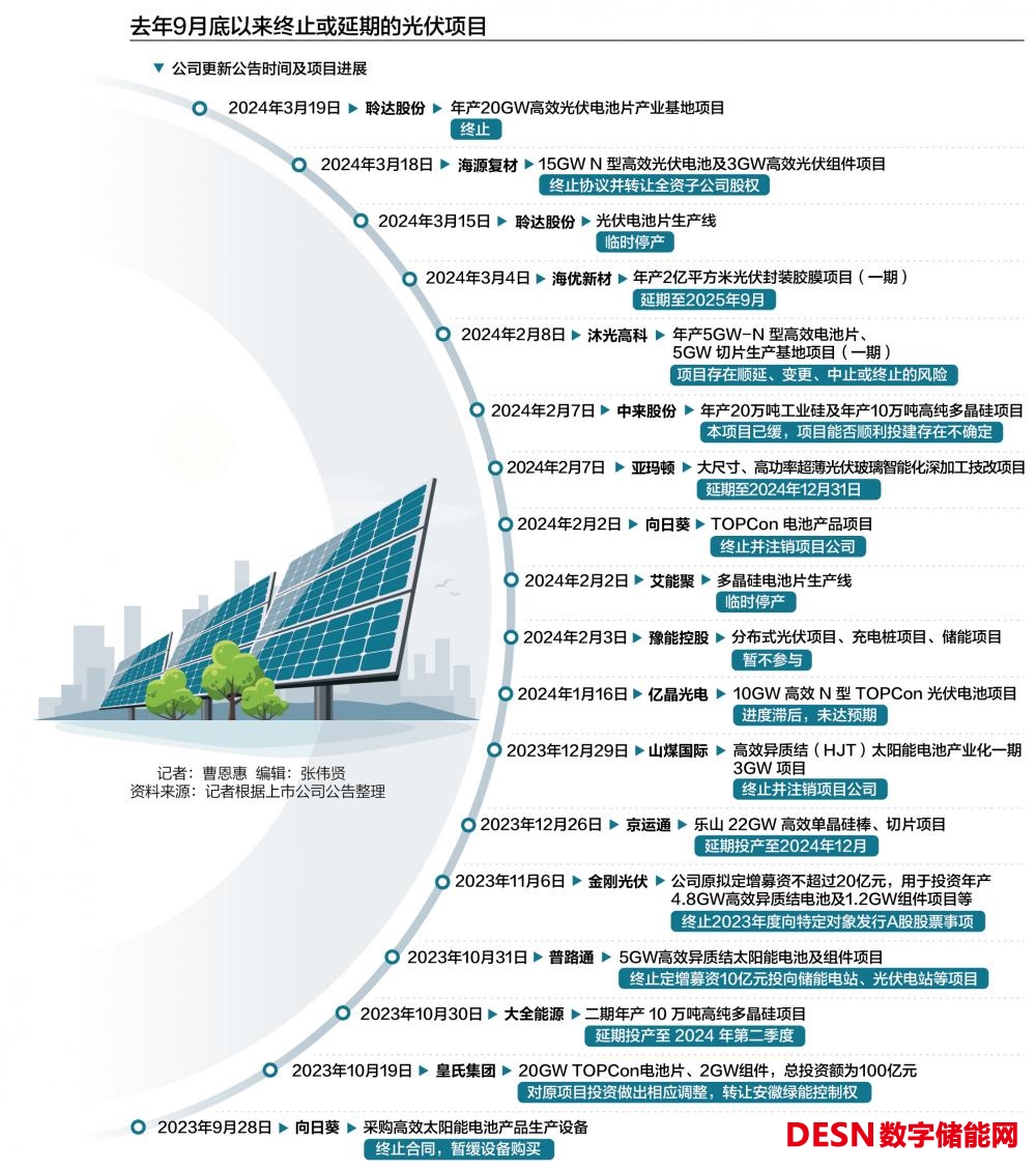 此外,大量的“腰部”光伏公司掙扎在基本面崩盤的風(fēng)險(xiǎn)邊緣。加之產(chǎn)業(yè)淘汰賽越發(fā)激烈,不少A股光伏公司紛紛宣布終止、延緩產(chǎn)投項(xiàng)目。
