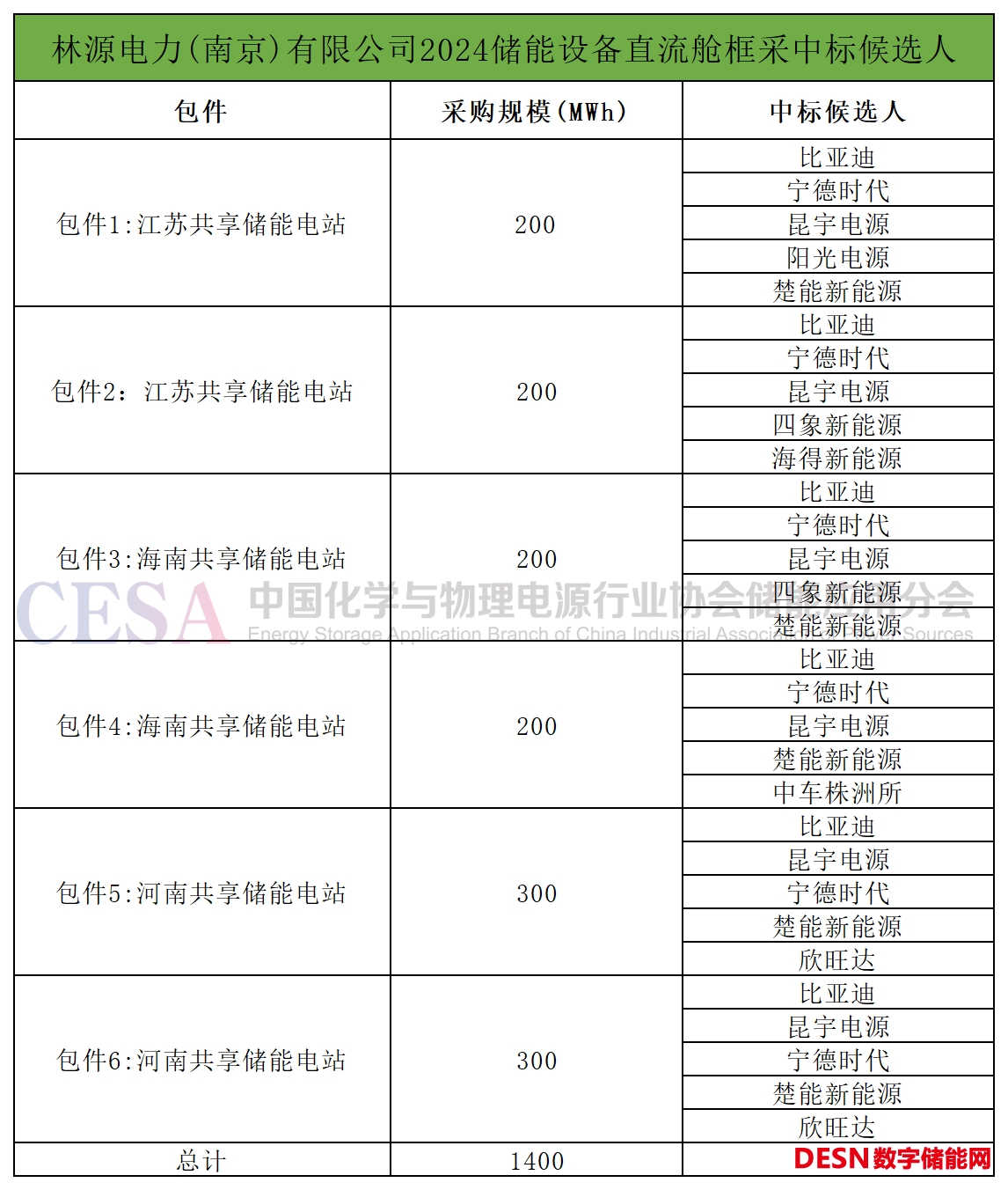 中國儲(chǔ)能網(wǎng)訊:3月27日,林源電力(南京)有限公司公示2024儲(chǔ)能設(shè)備直流艙框架采購中標(biāo)候選人,比亞迪、寧德時(shí)代等9家企業(yè)入圍,本次采購規(guī)模為1.4GWh,共6個(gè)包件。