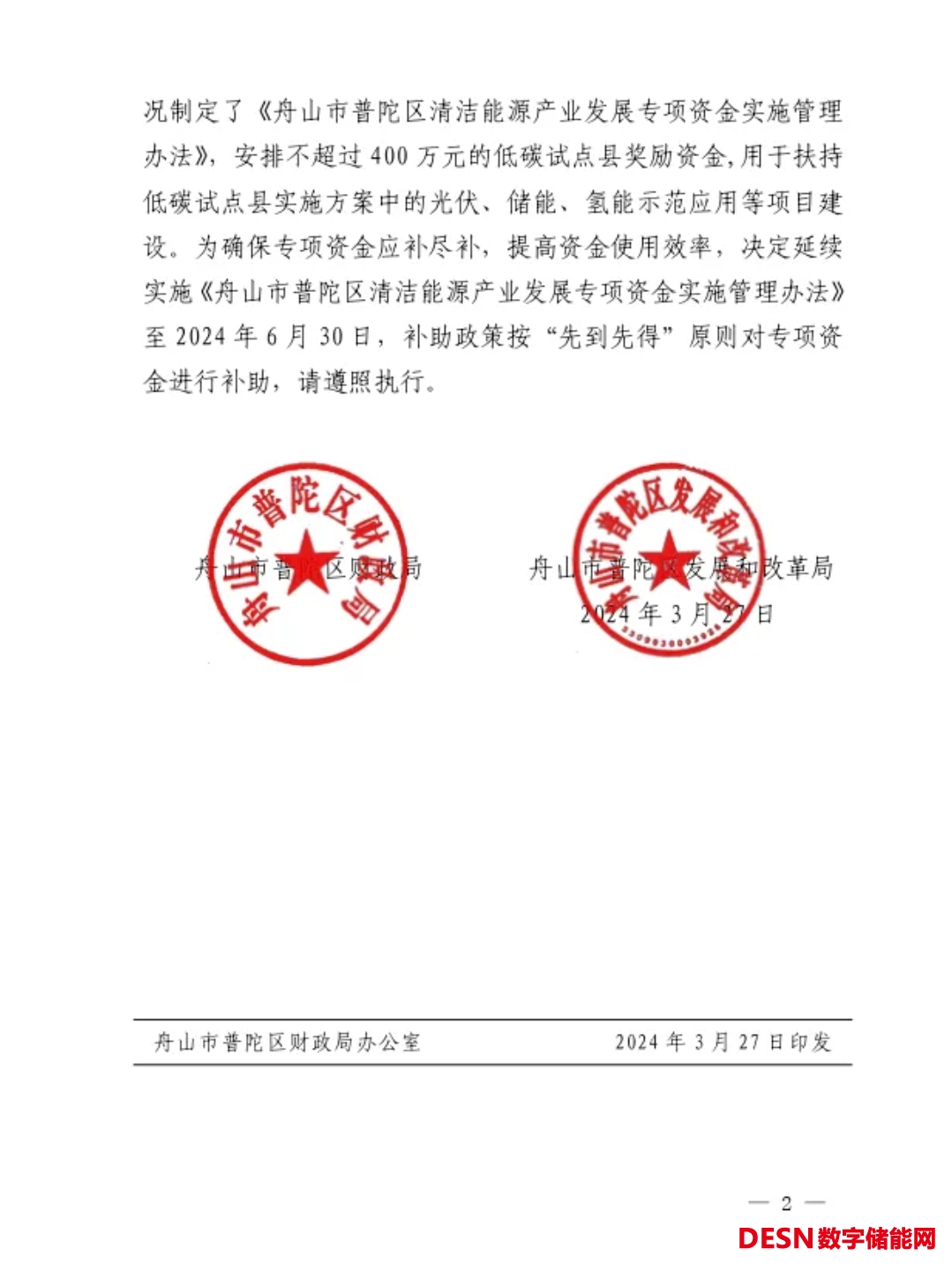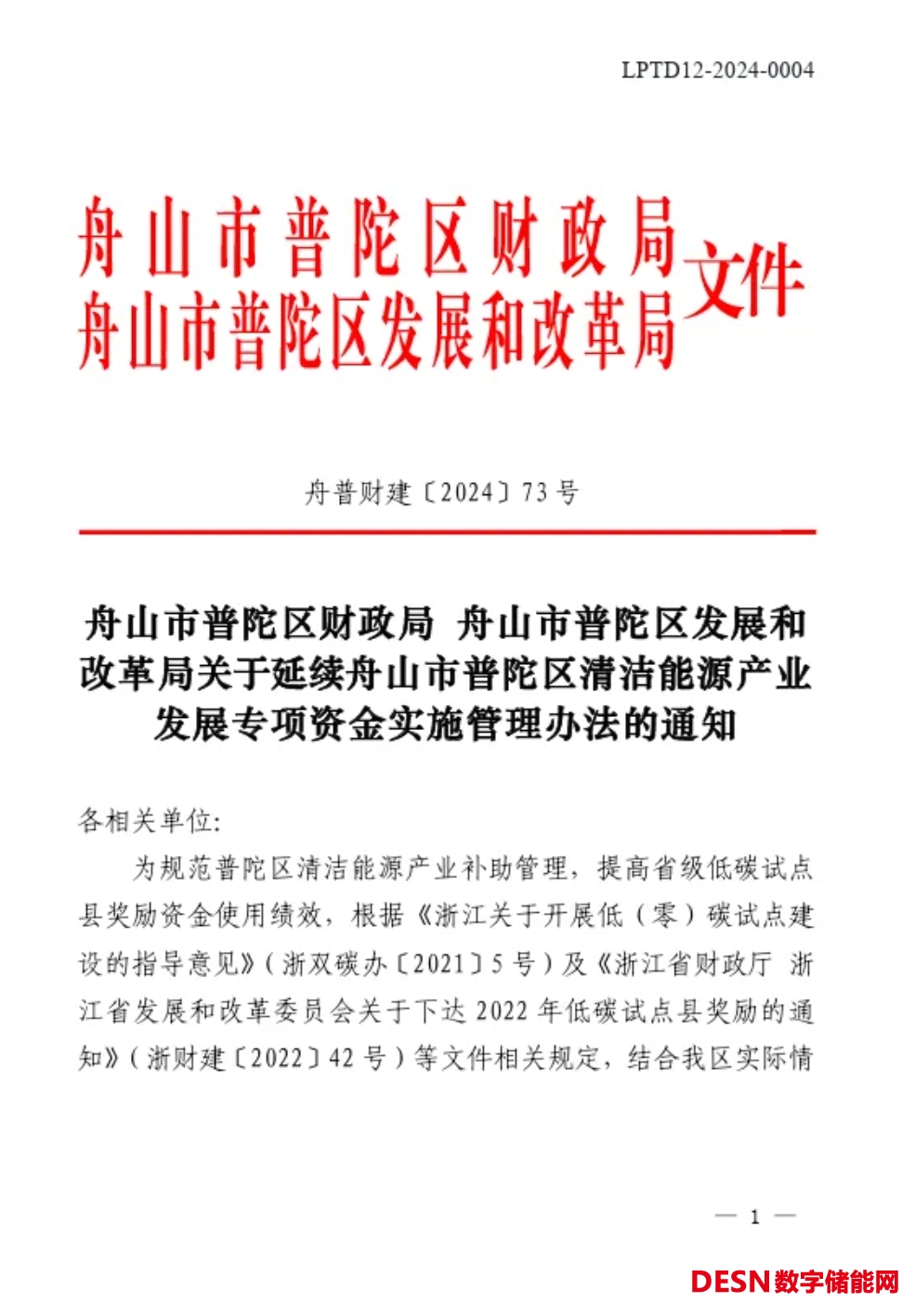 為規(guī)范普陀區(qū)清潔能源產(chǎn)業(yè)補助管理,提高省級低碳試點縣獎勵資金使用績效,根據(jù)《浙江關(guān)于開展低(零)碳試點建設(shè)的指導意見》(浙雙碳辦〔2021〕5號)及《浙江省財政廳 浙江省發(fā)展和改革委員會關(guān)于下達2022年低碳試點縣獎勵的通知》(浙財建〔2022〕42號)等文件相關(guān)規(guī)定,結(jié)合我區(qū)實際情況制定了《舟山市普陀區(qū)清潔能源產(chǎn)業(yè)發(fā)展專項資金實施管理辦法》,安排不超過400萬元的低碳試點縣獎勵資金,用于扶持低碳試點縣實施方案中的光伏、儲能、氫能示范應用等項目建設(shè)。為確保專項資金應補盡補,提高資金使用效率,決定延續(xù)實施《舟山市普陀區(qū)清潔能源產(chǎn)業(yè)發(fā)展專項資金實施管理辦法》至2024年6月30日,補助政策按“先到先得”原則對專項資金進行補助,請遵照執(zhí)行。