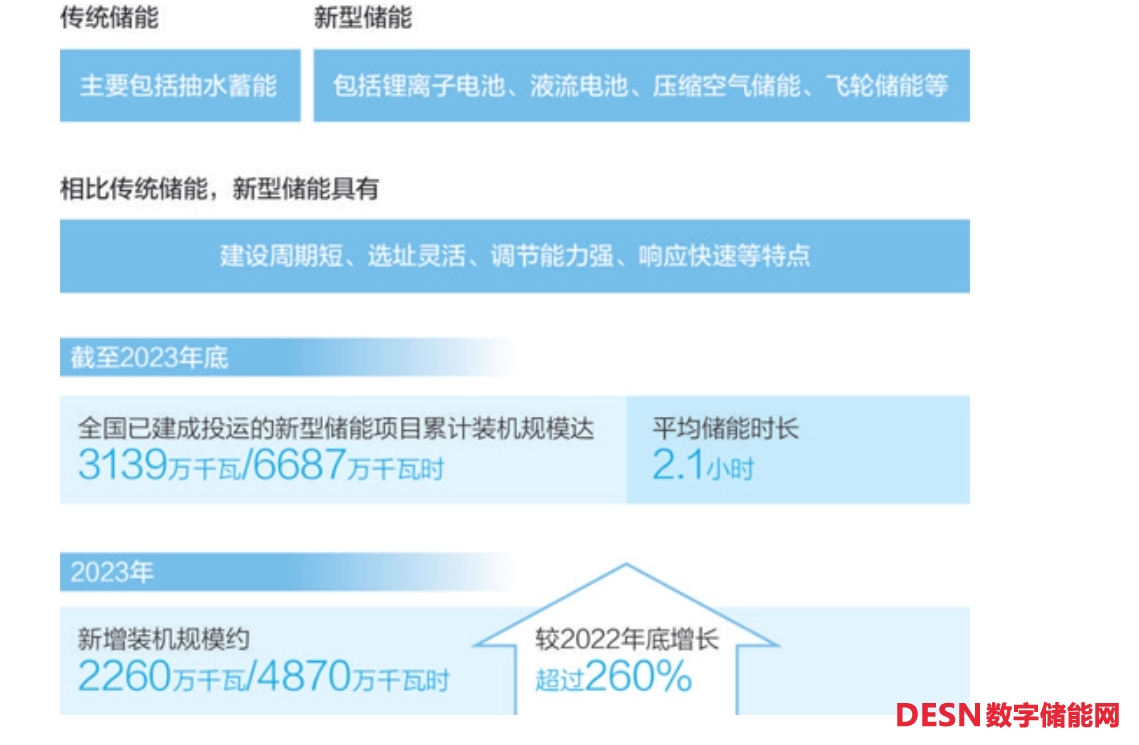 今年的《政府工作報告》提出,發(fā)展新型儲能。新型儲能是實現(xiàn)碳達(dá)峰碳中和目標(biāo)的重要支撐,包括鋰離子電池、液流電池、壓縮空氣儲能、飛輪儲能等,具有建設(shè)周期短、選址靈活、調(diào)節(jié)能力強、響應(yīng)快速等特點。國家能源局?jǐn)?shù)據(jù)顯示,截至2023年底,全國已經(jīng)建成投運新型儲能項目累計裝機規(guī)模達(dá)3139萬千瓦/6687萬千瓦時,平均儲能時長2.1小時;2023年新增裝機規(guī)模約2260萬千瓦/4870萬千瓦時,較2022年底增長超過260%。