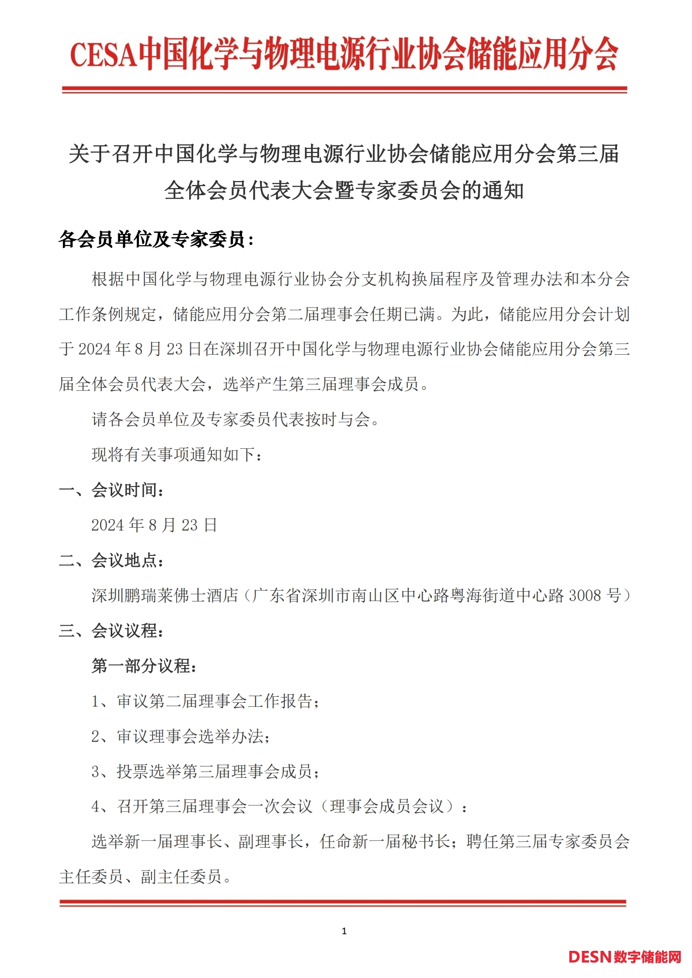 根據(jù)中國(guó)化學(xué)與物理電源行業(yè)協(xié)會(huì)分支機(jī)構(gòu)換屆程序及管理辦法和本分會(huì)工作條例規(guī)定,儲(chǔ)能應(yīng)用分會(huì)第二屆理事會(huì)任期已滿(mǎn)。為此,儲(chǔ)能應(yīng)用分會(huì)計(jì)劃于2024年8月23日在深圳召開(kāi)中國(guó)化學(xué)與物理電源行業(yè)協(xié)會(huì)儲(chǔ)能應(yīng)用分會(huì)第三屆全體會(huì)員代表大會(huì),選舉產(chǎn)生第三屆理事會(huì)成員。