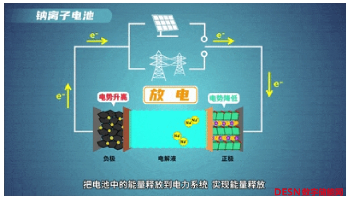 放電時,鈉離子運動方向與充電過程相反,正極電勢降低,負(fù)極電勢升高,把電池中的能量釋放到電力系統(tǒng),實現(xiàn)能量釋放。