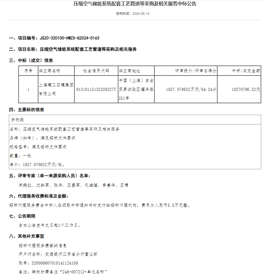 中國儲能網(wǎng)訊:5月14日,南京公共采購信息網(wǎng)發(fā)布壓縮空氣儲能系統(tǒng)配套工藝管道等采購及相關(guān)服務(wù)中標(biāo)公告,上海建工四建集團(tuán)有限公司成功中標(biāo),中標(biāo)價格為19270786.32元。