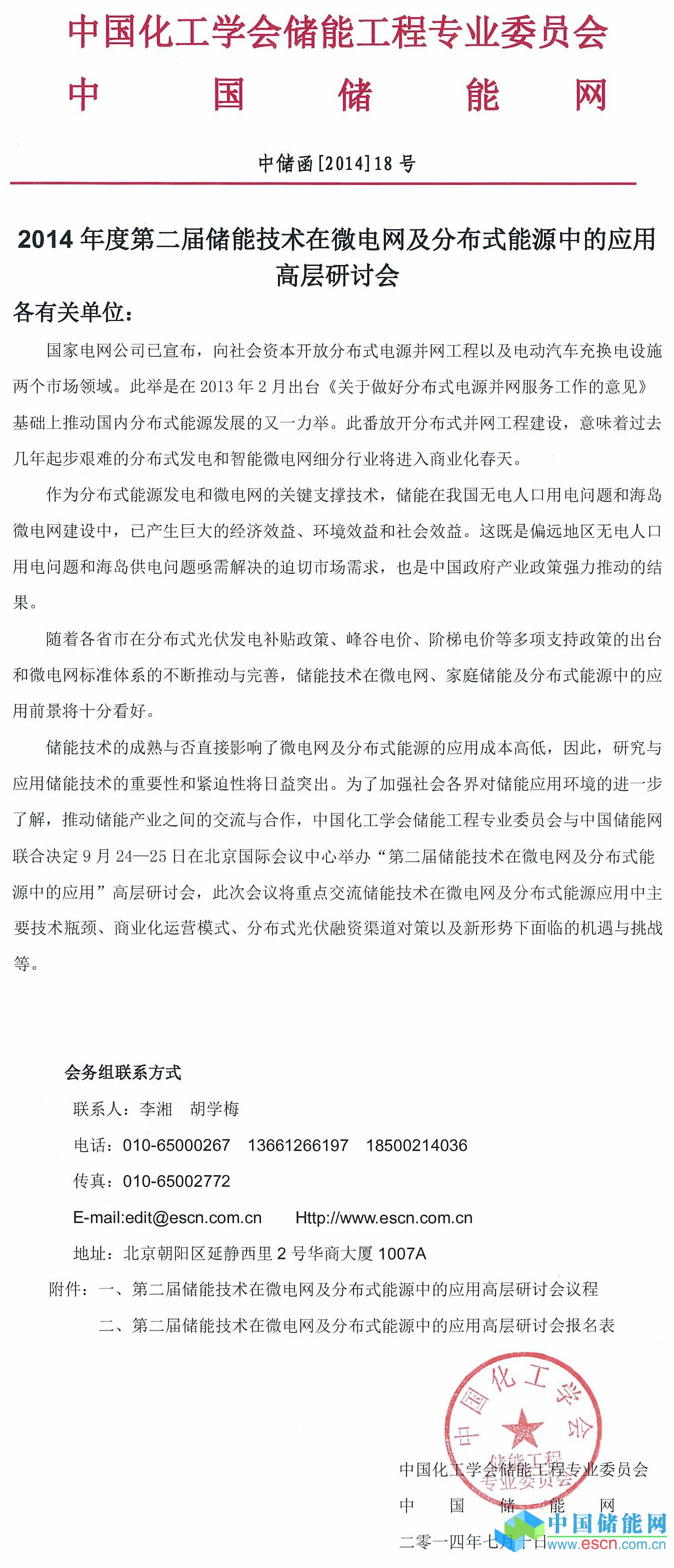 關(guān)于召開(kāi)第二屆儲(chǔ)能技術(shù)在微電網(wǎng)及分布式能源中的應(yīng)用高層研討會(huì)的通知