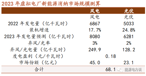 我們測(cè)算了2023年虛擬電廠新能源消納業(yè)務(wù)的市場(chǎng)規(guī)模,根據(jù)2022年風(fēng)光發(fā)電量和裝機(jī)增速,得到2023年預(yù)計(jì)發(fā)電量分別為6867億和5033億千瓦時(shí),假設(shè)棄風(fēng)率3%,棄光率2%,根據(jù)冀北虛擬電廠的新能源消納度電收益 0.18元,得到2023年市場(chǎng)規(guī)模約為68億元。隨著我國(guó)能源轉(zhuǎn)型,新能源裝機(jī)占比繼續(xù)提升,未來(lái)這一市場(chǎng)規(guī)模將繼續(xù)擴(kuò)大。