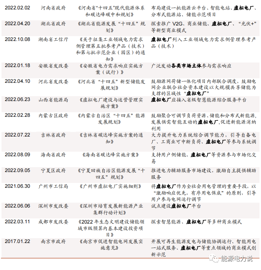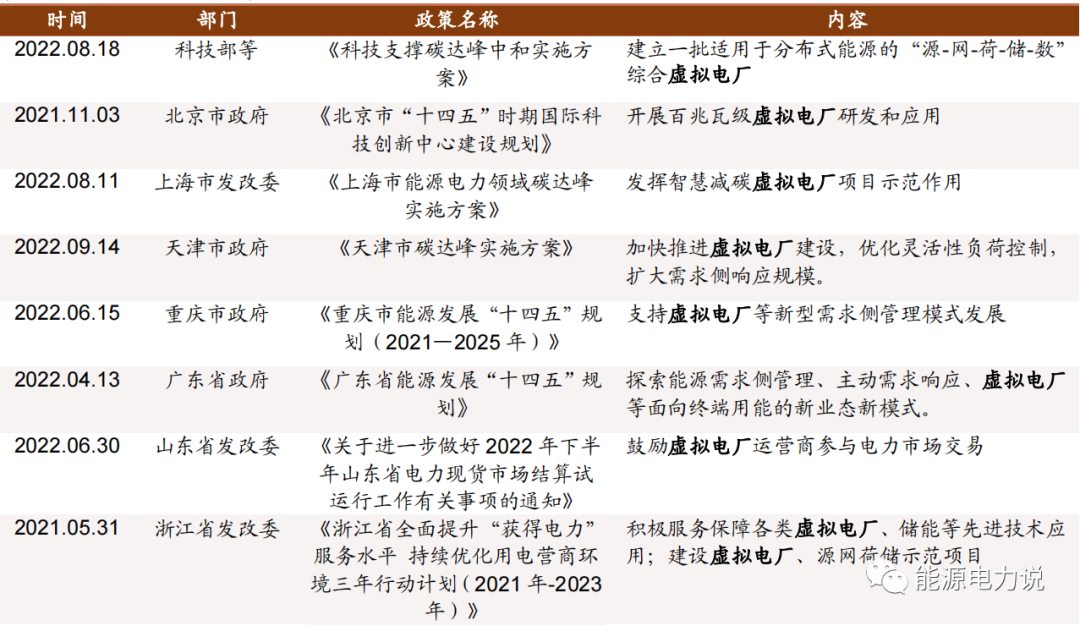 政府層面已經(jīng)意識(shí)到虛擬電廠是實(shí)現(xiàn)需求側(cè)響應(yīng)的重要智能化升級(jí)手段,出臺(tái)了一系列相關(guān)規(guī)劃和建設(shè)方案。根據(jù)我們統(tǒng)計(jì),2021年以來(lái)有21省份和直轄市明確提出支持虛擬電廠發(fā)展政策,北京、深圳和天津等地開(kāi)展虛擬電廠試點(diǎn)項(xiàng)目,加快推進(jìn)虛擬電廠建設(shè),多個(gè)省份支持虛擬電廠、儲(chǔ)能等市場(chǎng)主體參與電力市場(chǎng)交易。