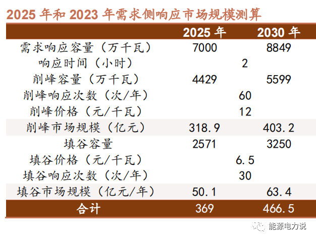 根據(jù)預(yù)測(cè)2025年全國(guó)需求側(cè)響應(yīng)規(guī)模7000萬(wàn)千瓦,2030年8849萬(wàn)千瓦。參考國(guó)家電網(wǎng)數(shù)據(jù),假設(shè)削峰和填谷容量占比分別為63%、37%,響應(yīng)次數(shù)分別為60次/年、30次/年,響應(yīng)時(shí)間2小時(shí),參考江蘇省政策,削峰價(jià)格12元/千瓦,填谷平均價(jià)格6.5元/千瓦,我們測(cè)算,2025年我國(guó)需求側(cè)響應(yīng)市場(chǎng)規(guī)模約為369億元/年,2030年約為466.5億元/年。