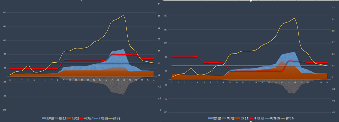 當(dāng)市場(chǎng)來(lái)臨的時(shí)候,部分國(guó)有發(fā)電企業(yè)的經(jīng)營(yíng)模式并沒(méi)有調(diào)整到位,可能存在經(jīng)營(yíng)決策失誤的原因。例如,中長(zhǎng)期簽約時(shí)未充分考慮自身節(jié)點(diǎn)和用戶側(cè)現(xiàn)貨價(jià)格的差異,不同發(fā)電企業(yè)、不同用戶一個(gè)策略,簡(jiǎn)單粗暴,不管簽?zāi)牡挠脩舳际且粋€(gè)價(jià),只重視合同價(jià)格的高低,不考慮價(jià)差電費(fèi)的高低,有些甚至不在合同中約定分時(shí)價(jià)格。如圖4所示,左圖與右圖用戶電量相同,左圖用戶合同價(jià)為0.4元/度,右圖用戶合同價(jià)為0.3元/度,兩個(gè)用戶用電曲線形狀不同,其他均相同。從大烏海區(qū)域部分電源的選擇來(lái)看,顯然更喜歡左圖用戶,然而事實(shí)卻告訴我們:由于右圖用戶價(jià)差電費(fèi)要遠(yuǎn)高于左圖用戶的價(jià)差電費(fèi),最終的結(jié)算結(jié)果是合同價(jià)低25%的右圖用戶可以為電源帶來(lái)的電費(fèi)(紅色部分)高于左圖用戶。