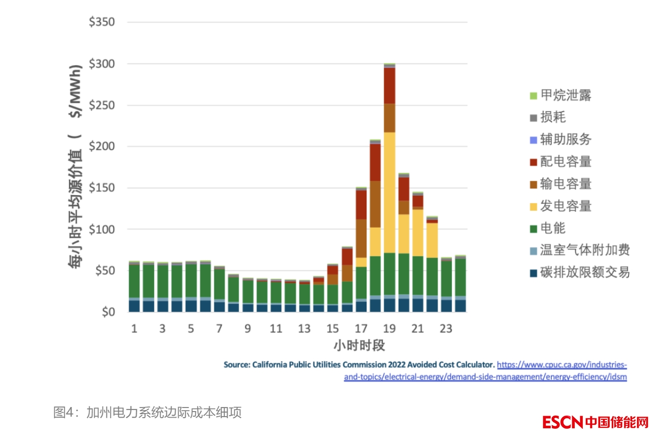 上面列出的這些邊際成本是整個(gè)北美電力系統(tǒng)最常使用的類別。但是,適用于各個(gè)電力系統(tǒng)的具體邊際成本類別可能有所不同。將各類邊際成本加在一起,就可產(chǎn)生總的邊際成本。圖4顯示了加州的一項(xiàng)計(jì)算結(jié)果。需要注意的是,這個(gè)每日輪廓圖代表了所有季節(jié)的平均值,而每個(gè)季節(jié)的數(shù)值可能有高有低。