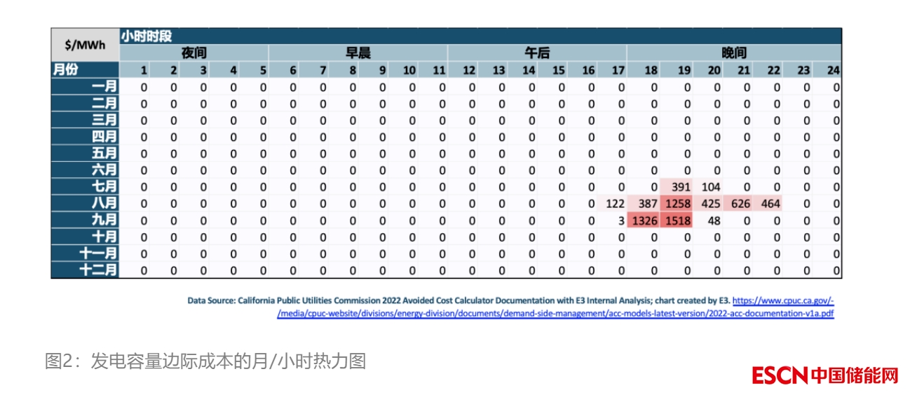 計(jì)算電能量的邊際成本有多種方法,其中一種是生產(chǎn)模擬模型,它可以在特定的約束條件下(如發(fā)電機(jī)組和輸電限制),以最小成本(即經(jīng)濟(jì)最優(yōu))的方式,模擬每小時(shí)(甚至每幾十分鐘)電力系統(tǒng)的運(yùn)行情況。這些數(shù)據(jù)可以匯總為每個(gè)月各小時(shí)的平均值,以體現(xiàn)經(jīng)常出現(xiàn)的每日和季節(jié)性模式,并看出邊際成本在何時(shí)更高。下圖顯示了美國加州采用生產(chǎn)模擬模型計(jì)算的結(jié)果。