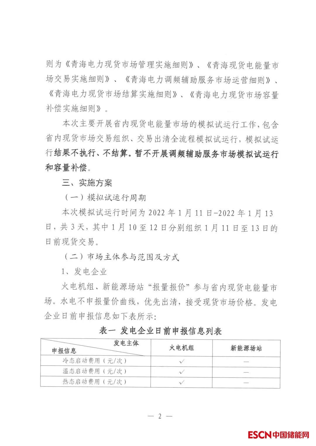 中國儲(chǔ)能網(wǎng)訊:1月5日,青海省能源局1月5日印發(fā)青海電力現(xiàn)貨市場(chǎng)第一次模擬試運(yùn)行方案的通知(青能運(yùn)行〔2023〕2號(hào))。通知指出,擬定于2023年1月11日-13日開展青海電力現(xiàn)貨市場(chǎng)第一次模擬試運(yùn)行。模擬試運(yùn)行期間儲(chǔ)能電站不參與定價(jià),接受電力現(xiàn)貨市場(chǎng)價(jià)格。